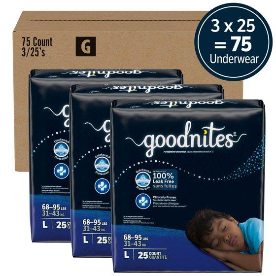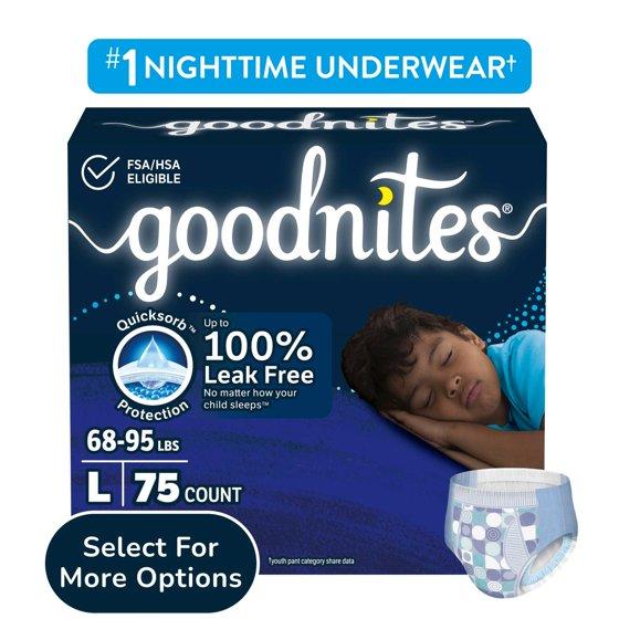 - Goodnites Boys' Nighttime Bedwetting Underwear: 75 overnight underwear for boys, size large; fits children 68-95 lbs