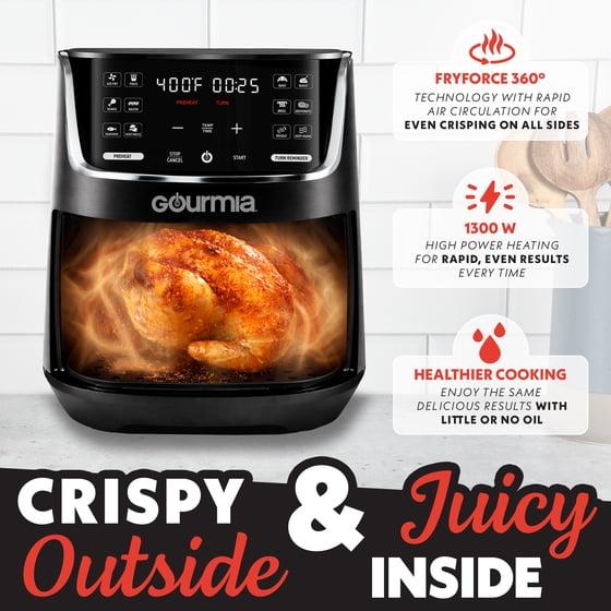 - Gourmia's FryForce 360 Technology fries with air for up to 80% less fat