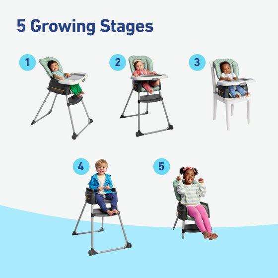 - 5 Growing Stages include Infant Recline, Baby Highchair, Toddler Booster, Youth Stool, and Big Kid Chair