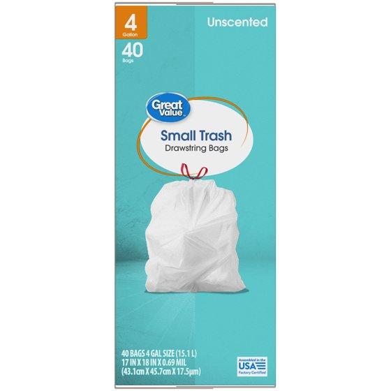 - Great Value 4-Gallon Small Drawstring Trash Bags, 40 Bags