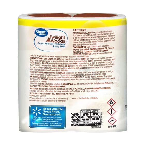 - Great Value Automatic Air Freshener Spray Refill, Twilight Woods, 2 Pieces