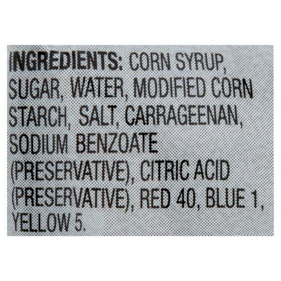 Corn Syrup, Sugar, Water, Modified Cornstarch, Slat, Carrageenan, Sodium Benzoate (Preservative), Citric Acid, Preservative), Citric Acid (Preservative), Red 40, Blue 1, Yellow 5.