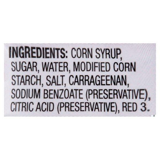 Corn Syrup, Sugar, Water, Modified Cornstarch, Salt, Carrageenan, Sodium Benzoate (Preservative), Citric Acid (Preservative), Red 3.