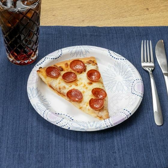 Serve food with ease using Great Value Everyday Disposable Paper Plates. They're perfect for everyday use or for special occasions. These round plates are strong making them ready for whatever meal you make. Use these plates at your next residential barbecue, birthday party, while you're watching the game, at your next pool party, or any get-together. Their 9-inch size makes them suitable for barbecue dishes, snacks, dinner, lunch, desserts, and more. They're also soak-proof, microwave safe, and offer quick and easy disposal and clean-up for when the party is over. This package comes with 200 pleasantly decorated plates making it easy to stock up for any occasion. Easily serve food when you use Great Value Everyday Disposable Plates.