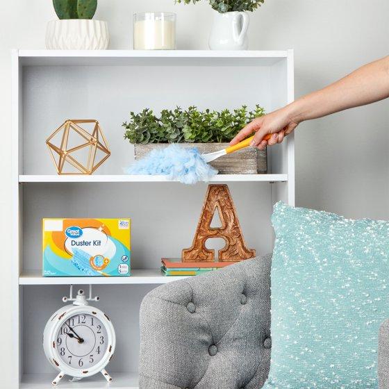Clean all the hard-to-reach corners of your home with our Great Value Duster Kit. Each box includes one pronged handle and five dusters. Attach a duster and shake to fluff before using on any dry surface that attracts dust such as blinds, radiators, mantels, televisions, and more. Be sure to avoid dusting hot or wet surfaces or using spray or liquid cleaning solvents. The handle features a helpful button to keep your duster secure. Dust hiding in nooks and crannies does not stand a chance against our Great Value Duster Kit!