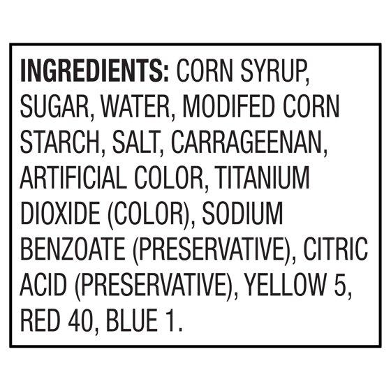 Corn Syrup, Sugar, Water, Modified Corn Starch, Salt, Carrageenan, Artificial Color, Titanium Dioxide (Color), Sodium Benzoate (Preservative), Citric Acid (Preservative), Yellow 5, Red 40, Red 1.