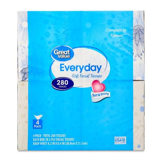 - Great Value Everyday Soft Facial Tissues, 4 Cube Cartons, of 70 Tissues per Cube, 2-Ply