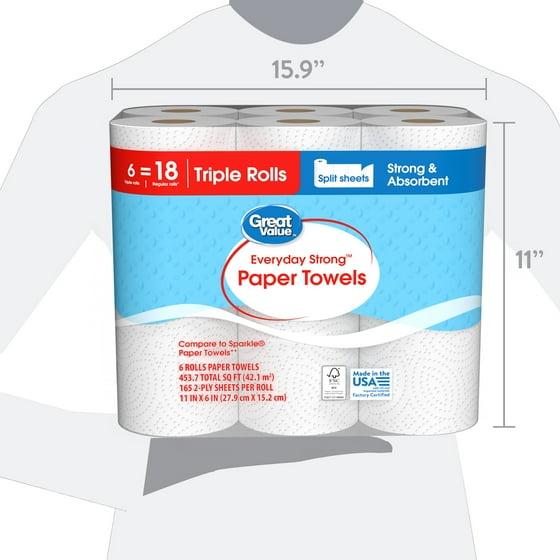 Great Value Everyday Strong Paper Towels, 6 Triple Rolls, Split Sheets