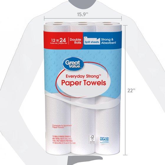 Great Value Everyday Strong Paper Towels, Split Sheets, 12 Double Rolls, Compare to Sparkle®