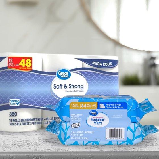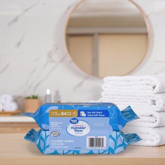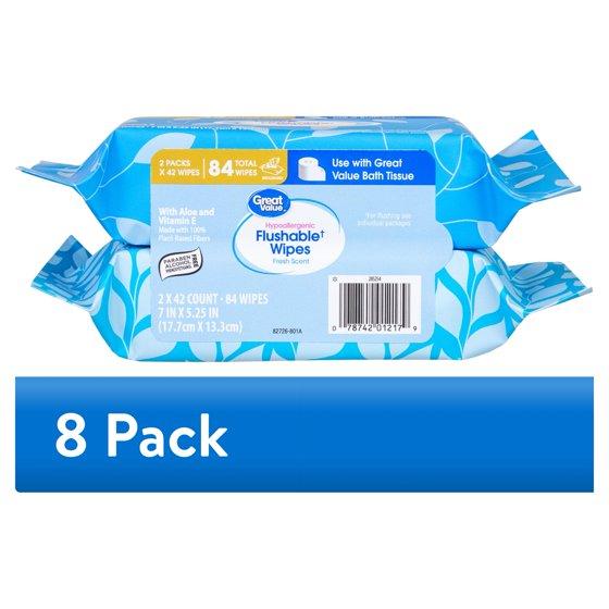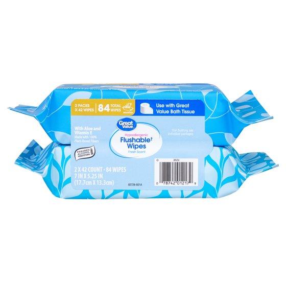 - Great Value Hypoallergenic Flushable Wipes, Fresh Scent, 2 Pack, 84 Wipes: