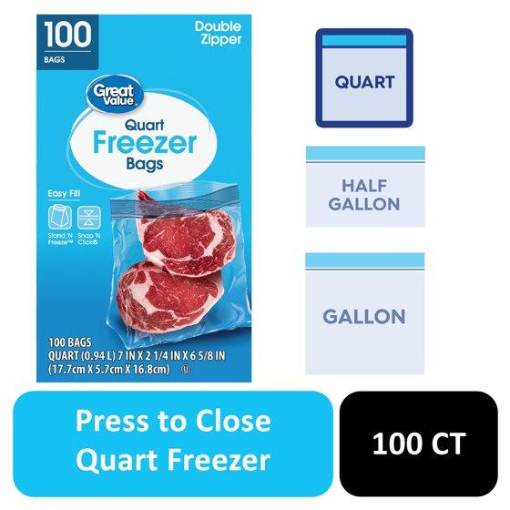 Freezing food at its freshest has never been easier than with the Great Value Freezer Guard Double Zipper Quart Freezer Bags. This pack contains 100 quart-sized freezer bags perfect for meal prep, leftovers, and more. Our convenient double zipper bags are also perfect for storing toiletries and other items for travel. For frozen foods that taste freshly made. Great Value products provide families with affordable, high-quality grocery and household consumable options.