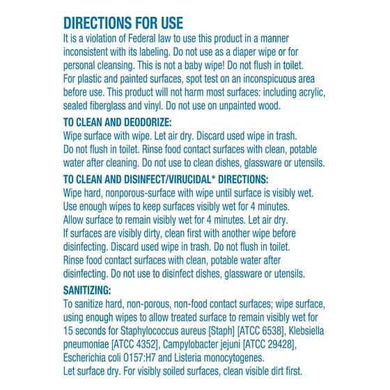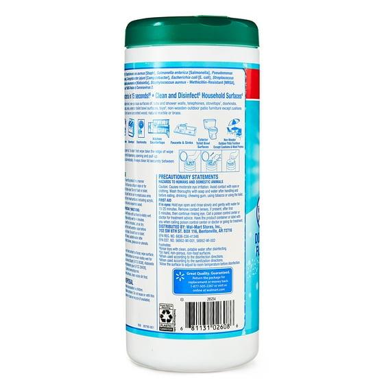 Wipe away tough everyday messes with Great Value Disinfecting Wipes. Our disinfecting wipes cut through dirt and grime on hard, non-porous surfaces while wiping away5 99% of bacteria and viruses* including the *Influenza Type A Virus. Use this product on washable, hard, non-porous surfaces such as bathroom fixtures, counters, doorknobs, telephones, and computer keyboards. To disinfect, wipe hard, non-porous surfaces with wipe until the surface is visibly wet. Allow surface to remain visibly wet for 4 minutes. If surfaces are visibly dirty, clean first with another wipe before disinfecting. Discard used wipe in trash. Do not flush in toilet. Rinse food contact surfaces with clean, potable water after disinfecting. Do not use to disinfect dishes, glassware or utensils. Keep a container of wipes in your house for daily and/or emergency clean-ups. 5When used according to the disinfection directions.