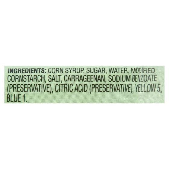 Corn Syrup, Sugar, Water, Modified Cornstarch, Salt, Carrageenan, Sodium Benzoate (Preservative), Citric Acid (Preservative), Yellow 5, Blue 1.