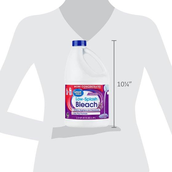 Great Value 81oz Low Splash Lavender scented Bleach is a great first step in achieving a cleaner, fresher household. Our all-in-one more concentrated formula whitens and brightens clothing, maintains already white and bright clothes, and even deodorizes them all while delivering a low-splash quality in every easy pour. Designed to work with most standard HE washers, you'll find convenience as the bleach fights against those tough-to-remove stains. It's also effective for cleaning common household surfaces such as bathrooms, kitchen surfaces, dishes, and sinks as well as cleaning and deodorizing pre-cleaned toilet bowls. Leave your home looking clean and smelling fresh with our Great Value Lavender Low-Splash Bleach.