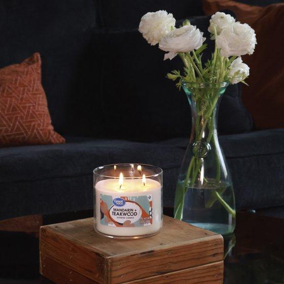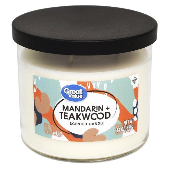 Great Value Mandarin & Teakwood Scented Candle is highly fragranced and infused with essential oils to give you a woody blend of teak, birch and driftwood that intrigues the senses with alluring aromatherapeutic additions of bright mandarin and cooling eucalyptus leaves. This candle has unique multi-wick technology that creates a beautiful ambiance and more effectively diffuses fragrance. Enjoy this wonderfully scented candle that will give you the relaxing feeling of being at a spa at an affordable price. Experience the wonderful scent of Great Value Mandarin & Teakwood Scented Candle today.