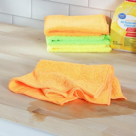 - 12-pack includes (12) 14" x 16" orange, yellow, and green microfiber cleaning towels