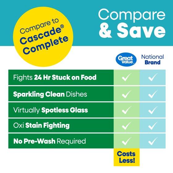 Get tough on grease, stains, and residue with Great Value Fresh Scent Automatic Dishwasher Pacs. Great Value Fresh Scent Automatic Dishwasher Pacs require no pre-rinse and are safe for septic systems. Containing enzymes to fight tough food residue and oxygen bleach to clean tough stains, your dishes will come out sparkling. Keep dishes sparkling clean with Great Value Fresh Scent Automatic Dishwasher Pacs.