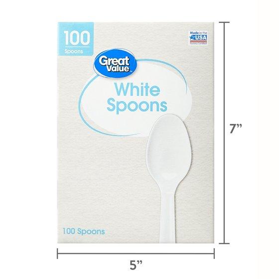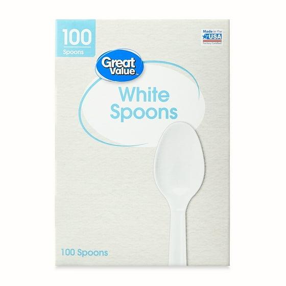 Entertaining is a breeze with Great Value Everyday White Spoons. Keep these spoons on hand for barbecues, picnics, tailgates, and home entertaining all year round. Each package contains 100 reliably strong and sturdy spoons, perfect for tackling even the toughest picnic challenges and meeting your entertaining needs, regardless of the crowd size. Use these disposable spoons at your next get together to make clean up a cinch! The white cutlery has a sleek look and finish, allowing your food to take center stage. Great Value makes it easy to stock up on assorted cutlery, so you're always prepared to host. Great Value Everyday White Spoons are convenient and disposable, making school lunches, family brunches, weeknight dinners, and holidays more manageable.