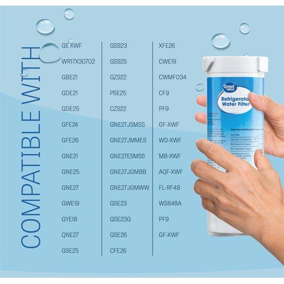 - Water filter replacement cartridge for GE fridge models including GWE19JSLSS, WR17X30702, GBE21, GDE21, GDE25, GFE24 (Not XWFE) GE XWF