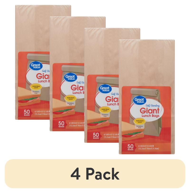 Great Value Self Standing Giant Lunch Bags, 50 Count are designed to hold larger meals with ease. Measuring 6 1/8 in x 4 in x 12 3/8 in, these flat-bottom paper bags stand upright on their own for easy filling and packing. Perfect for oversized lunches, meal prepping, snacks, or even gift wrapping, these sturdy kraft bags offer convenient and reliable use for busy days. Great Value Self Standing Giant Lunch Bags, 50 Count combine functionality and value for everyday needs.