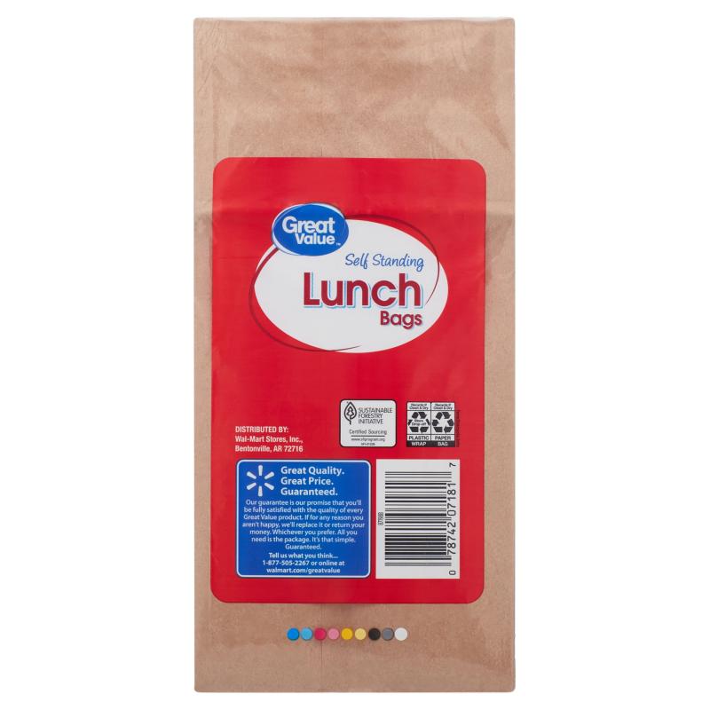 Great Value Self Standing Lunch Bags, 100 Count are the reliable and eco-friendly solution for packing meals and snacks. These flat-bottom kraft paper bags stand up on their own, making them easy to fill and ideal for lunches, small grocery items, party favors, or crafting. Each bag measures 5 1/8 in x 3 1/8 in x 10 5/8 in and is made with quality material for dependable use. Great Value Self Standing Lunch Bags, 100 Count offer convenient value for daily packing and organization.