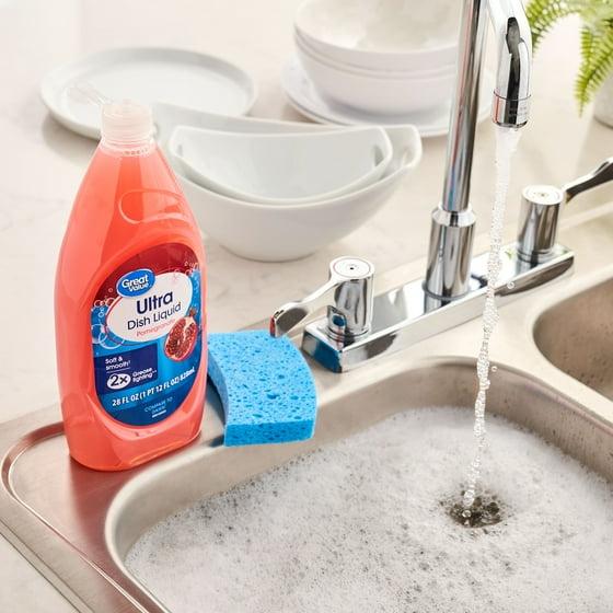 Great Value Pomegranate Soft and Smooth Ultra Dish Liquid keeps your plates, silverware, and glasses clean and shining. This ultra-concentrated dishwashing liquid formula has two times the grease-fighting power compared to non-concentrated dish soap and presents a pleasant pomegranate aroma as you clean up. The bottle is designed with a convenient pull-to-open top that allows you to get just the right amount of soap you want while conserving the rest. Enjoy a superior cleaning experience and admire the sparkling shine of your dishes every day.