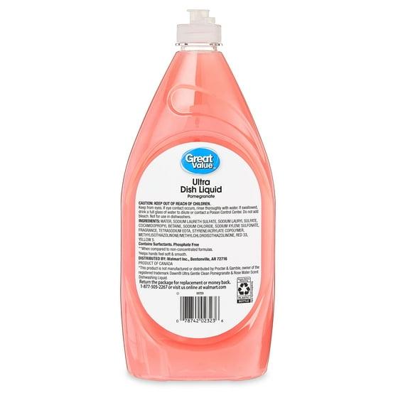 Great Value Pomegranate Soft and Smooth Ultra Dish Liquid keeps your plates, silverware, and glasses clean and shining. This ultra-concentrated dishwashing liquid formula has two times the grease-fighting power compared to non-concentrated dish soap and presents a pleasant pomegranate aroma as you clean up. The bottle is designed with a convenient pull-to-open top that allows you to get just the right amount of soap you want while conserving the rest. Enjoy a superior cleaning experience and admire the sparkling shine of your dishes every day.