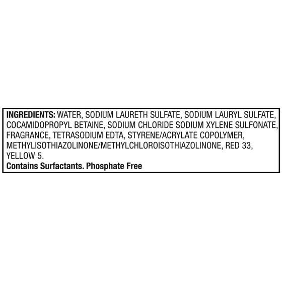 Water, Sodium Laureth Sulfate, Sodium Lauryl Silfate, Cocamidopropyl Betaine, Sodium Chloride Sodium Xylene Sulfonate, Fragrance, Tetrasodium EDTA, Styreme/Acrylate Copolymer, Methylisothiazolinone/Methylchloroisothiazolinone, Red 33, Yellow 5