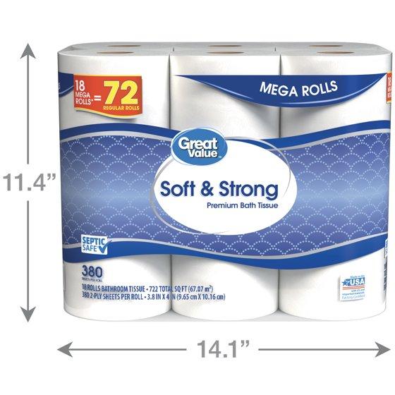 Great Value Soft & Strong Premium Toilet Paper features 2-ply sheets of toilet paper that are super strong and absorbent making it the perfect solution for all your bathroom needs. This pack includes 18 mega rolls which is equivalent to 72 regular rolls, so it's easy to stock up for you or your family. It is also safe for standard septic systems.