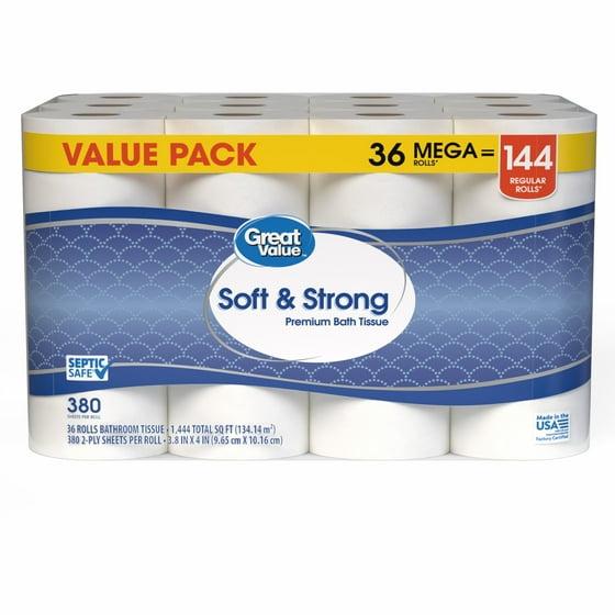 Great Value Soft & Strong Premium Toilet Paper, 36 Mega Rolls, 380 Sheets per Roll