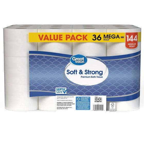 Great Value Soft & Strong Premium Toilet Paper features 2-ply sheets of toilet paper that are super strong and absorbent making it the perfect solution for all your bathroom needs. This pack includes 36 mega rolls, so it's easy to stock up for you or your family. It is also safe for standard septic systems.