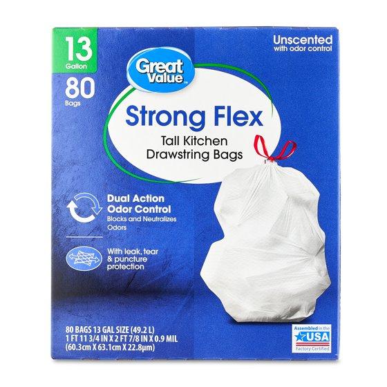 - Great Value Strong Flex Tall Kitchen Drawstring Bags, Unscented, 13 Gallon, 80 Count