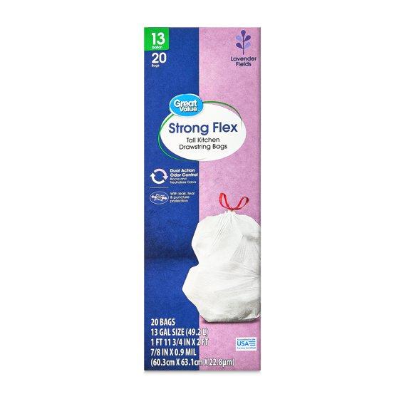 - Great Value Strong Flex 13-Gallon Drawstring Tall Kitchen Trash Bags, Lavender Fields, 20 Bags