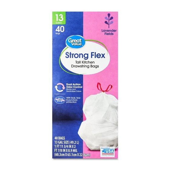 - Great Value Strong Flex 13-Gallon Drawstring Tall Kitchen Trash Bags, Lavender Fields, 40 Bags