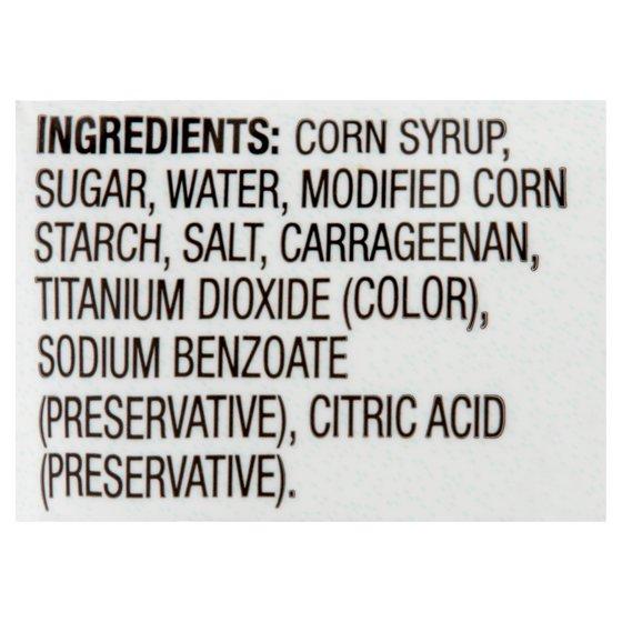Corn Syrup, Sugar, Water, Modified Cornstarch, Salt, Carrageenan, Titanium Dioxide (Color), Sodium Benzoate (Preservative), Citric Acid (Preservative)