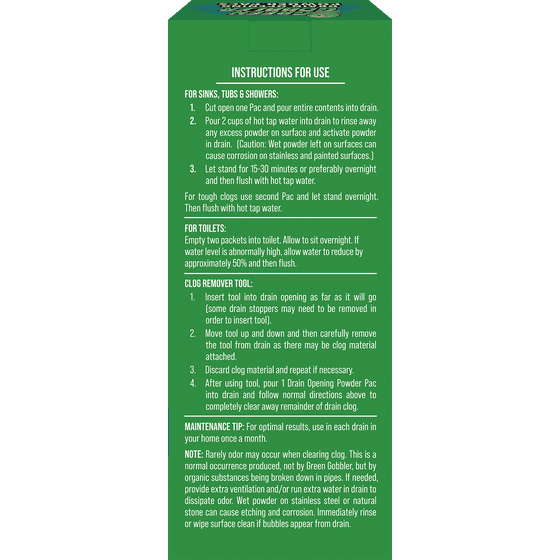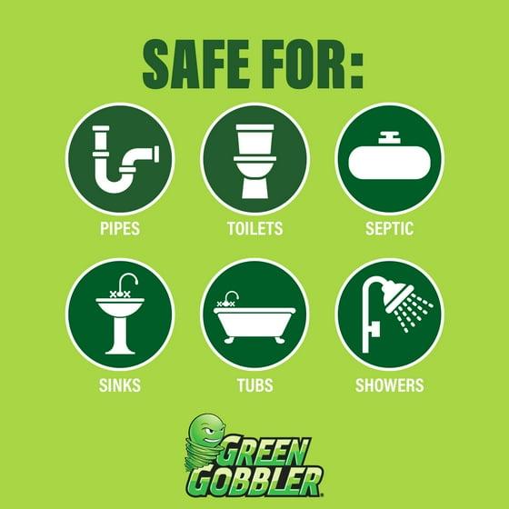- GREAT FOR CLOGGED TOILETS: Break up the toughest clogs with Green Gobbler Drain Opening Pacs. Safe for pipes and septic systems, it comes with three premeasured applications and a clog remover tool to make fighting clogs easier than ever.