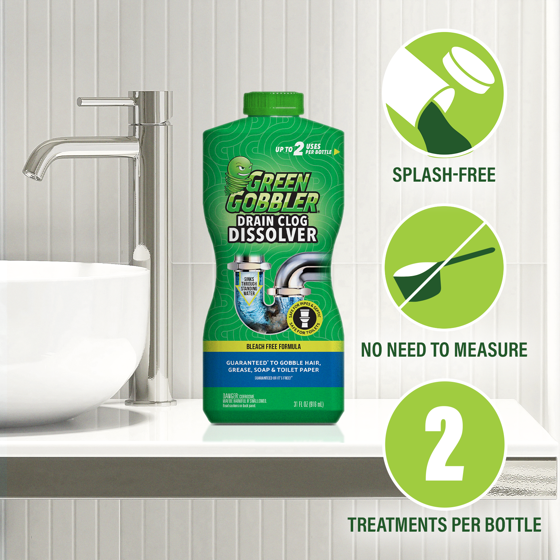 - DISSOLVES HAIR, SOAP, TOILET PAPER, GREASE & FLUSHABLE PERSONAL CARE WIPES: Forget the dirty work of plunging clogged toilets and backed-up drains. Green Gobbler sinks through standing water to clear clogs and keep your plumbing flowing properly. It dissolves hair, soap scum, toilet paper, flushable wipes and organic matter.