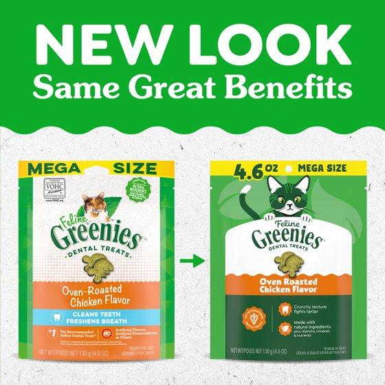 - This convenient pouch contains 4.6 oz. of FELINE GREENIES Crunchy Dental Treats in Oven Roasted Chicken Flavor
