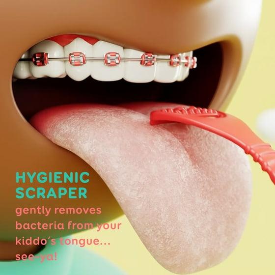 - Hygienic Scraper gently removes bacteria from your kiddo’s tongue…see-ya!