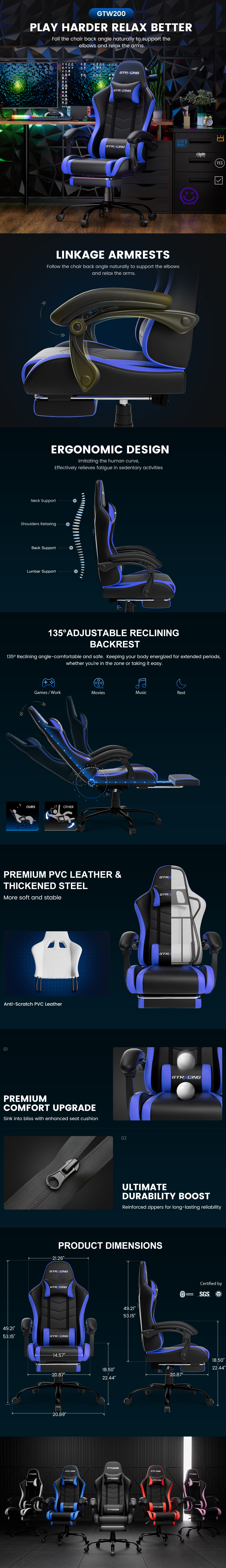 GTRACING Ergonomic GTWD-200 Gaming Chair with Adjustable Pillows and Footrest, Blue
