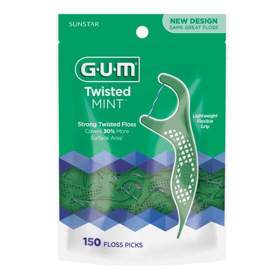 GUM Twisted Mint Floss Picks - Twisted Threads, Shred-Resistant Floss, Easy Grip Handle, 150 Count