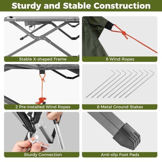 - Sturdy & Stable Frame: The cot is made of a 600D Oxford fabric mat for excellent durability, while the sturdy metal legs and non-slip foot pads ensure stability and can support up to 660 lbs/300 kg. Plus, this 2-in-1 combo camping set also includes wind ropes and stakes for fixation, making it reliable even in windy conditions.