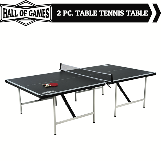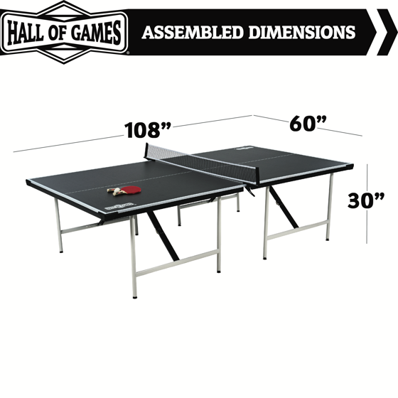 Bring home competitive-level fun with the Official Size Indoor Table Tennis Pong Table by Hall of Games. No assembly is required - just unfold it and you're ready to play! Ideal for game rooms, basements, rec rooms, or garage setups, this full-size pong table is designed for indoor use and comes with everything you need to start playing: a premium clamp-style net and post set, 2 paddles, 3 balls, and a magnetic storage bag that attaches to the frame when not in use. Built-in wheels on the underside allow for easy transport and storage. Whether you're looking for indoor pong fun with friends or adding something new to your family game night, this Hall of Games table tennis set is a great choice for players of all skill levels.