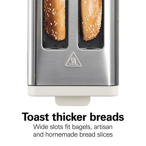 - TOAST THICKER BREADS: The wide slots on this bread toaster fit thicker breads. Easily toast bagels, artisan and homemade bread slices.