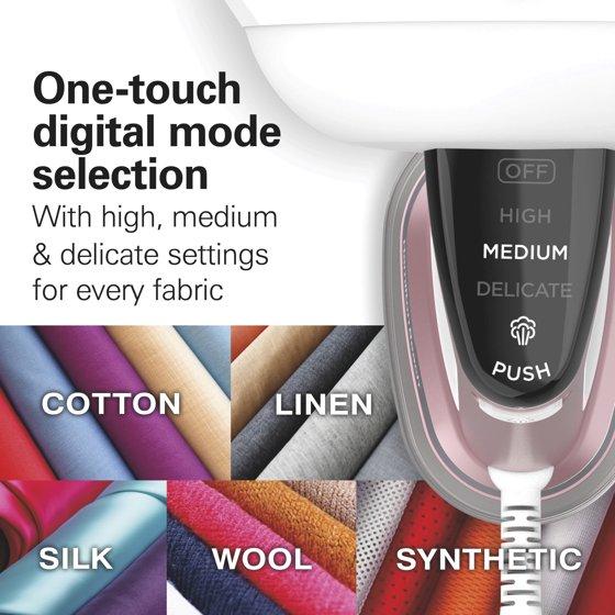 - ONE-TOUCH DIGITAL MODE SELECTION: Illuminated digital button lets you choose high, medium, or delicate steam modes and power on or off easily.