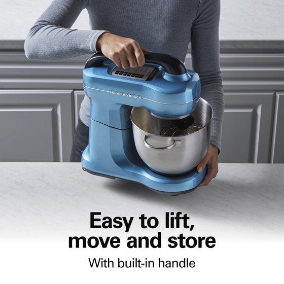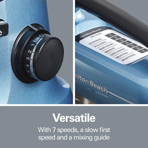 - Hamilton Beach 4 Quart Stand Mixer for Kitchen, 7 Speeds, Tilt-Head, Dough Hook, Whisk & Flat Beater, Blue