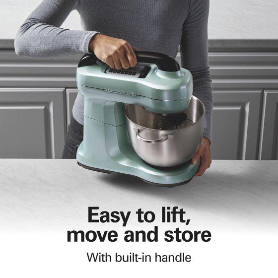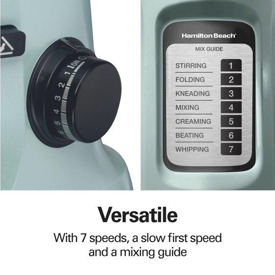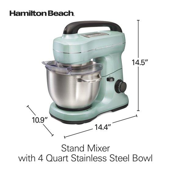 - Hamilton Beach 4 Quart Stand Mixer for Kitchen, 7 Speeds, Tilt-Head, Dough Hook, Whisk & Flat Beater, Aqua