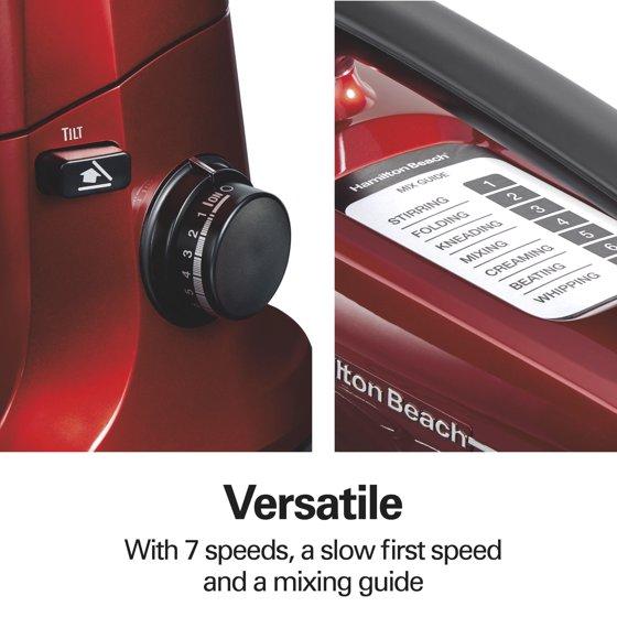 - Hamilton Beach 4 Quart Stand Mixer for Kitchen, 7 Speeds, Tilt-Head, Dough Hook, Whisk & Flat Beater, Red
