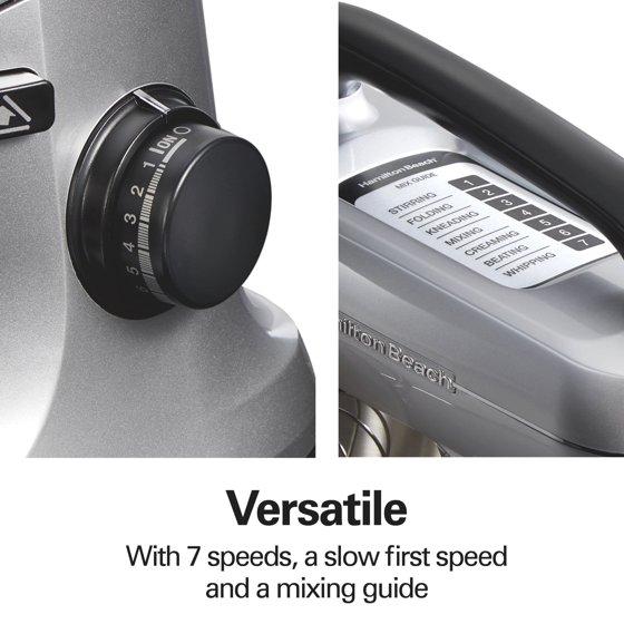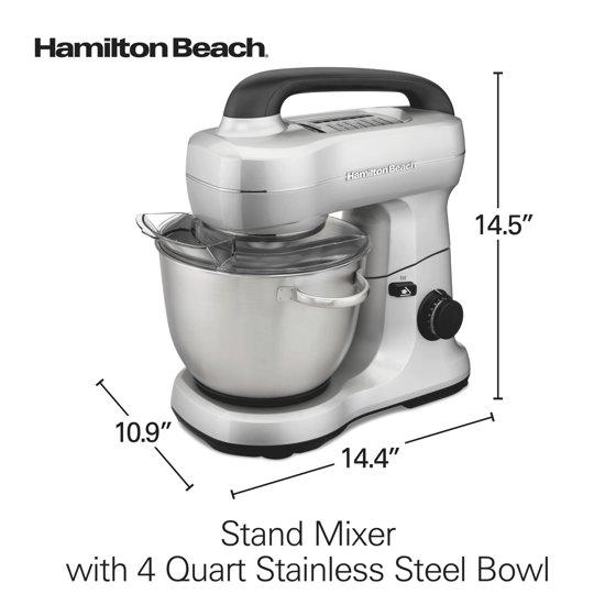 - Hamilton Beach 4 Quart Stand Mixer for Kitchen, 7 Speeds, Tilt-Head, Dough Hook, Whisk & Flat Beater, Silver