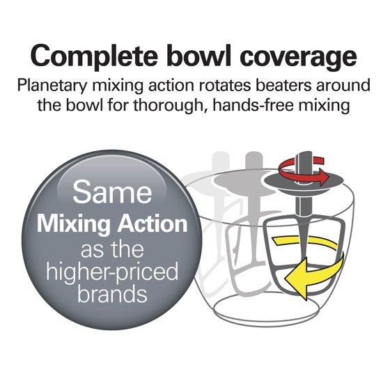 - Mixing action gives complete bowl coverage; better mixing than 2-beater stand mixers